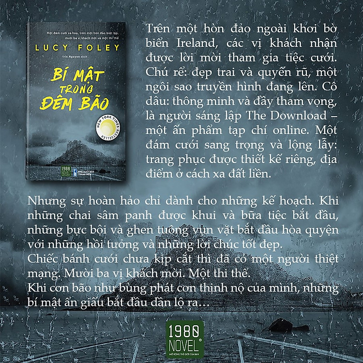 Cuốn tiểu thuyết “Bí Mật Trong Đêm Bão” của tác giả Iris Nguyen đưa người đọc vào một hành trình đầy kịch tính và bất ngờ trên một hòn đảo nhỏ xinh đẹp ngoài khơi bờ biển Ireland. Tại đây, một bữa tiệc cưới đang diễn ra với sự tham gia của nhiều vị khách mời đặc biệt. Chú rể là một ngôi sao truyền hình điển trai và quyến rũ, trong khi cô dâu lại là một người phụ nữ thông minh, đầy tham vọng, mang trong mình những giấc mơ lớn lao.