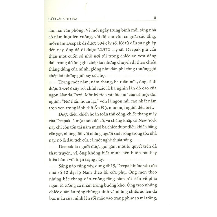 “Cô Gái Như Em” là một câu chuyện diễn ra tại New York, nơi mà mỗi góc phố, mỗi tòa nhà đều mang trong mình những ký ức và bí mật. Tại một tòa nhà trên Đại lộ Năm, cư dân không chỉ sống bên nhau mà còn gắn bó với Deepak, người gác thang máy mẫn cán. Anh không chỉ là người điều khiển chiếc thang máy mà còn là người lắng nghe và sẻ chia những tâm tư của cư dân. Cuốn sách mở ra một bức tranh về cuộc sống hàng ngày, nơi mà những khó khăn, niềm vui và cả nỗi buồn được chia sẻ và thấu hiểu.