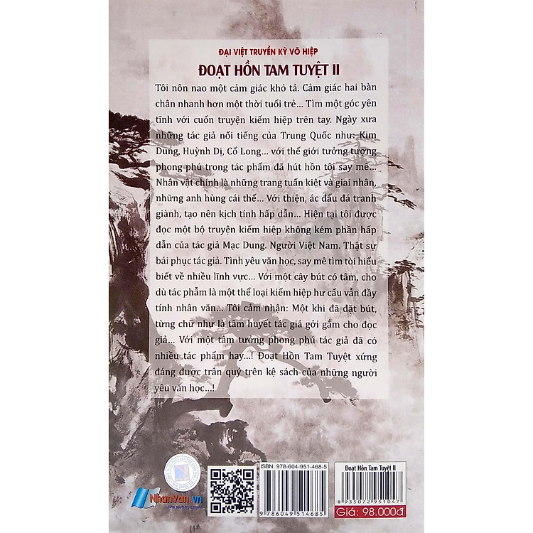 Sản phẩm “Đại Việt Truyền Kỳ Võ Hiệp – Đoạt Hồn Tam Tuyệt II” được phát hành bởi Công ty Văn Hóa Nhân Văn và được in ấn bởi Nhà Xuất Bản Hồng Đức. Với nội dung cuốn hút và cốt truyện lôi cuốn, đây là lựa chọn hoàn hảo cho những ai yêu thích thể loại tiểu thuyết võ hiệp.