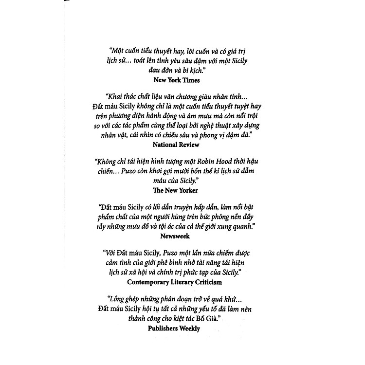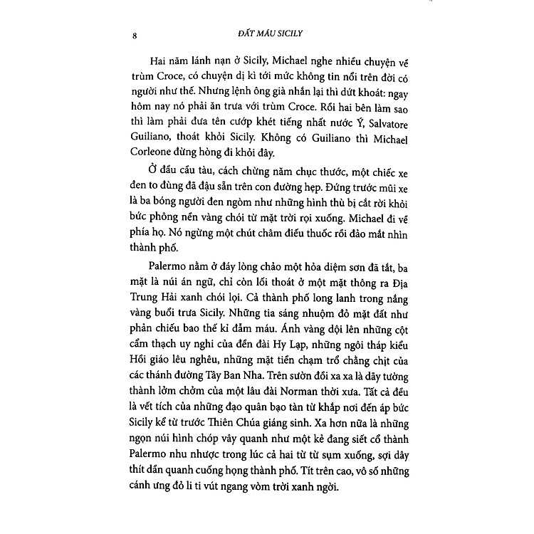 “Đất Máu Sicily” của tác giả Mario Puzo là một tác phẩm không chỉ đơn thuần kể về mafia mà còn khắc họa một bức tranh toàn cảnh về xã hội Sicily – nơi mà luật lệ của mafia chiếm ưu thế hơn cả. Tác phẩm khám phá mối quan hệ giữa con người và quyền lực, tình yêu và sự phản bội, cũng như những lựa chọn khó khăn mà họ phải đối mặt trong cuộc chiến sinh tồn. Puzo đã khéo léo đưa độc giả vào những tình huống căng thẳng, nơi mà mỗi quyết định đều mang tính chất sống còn.