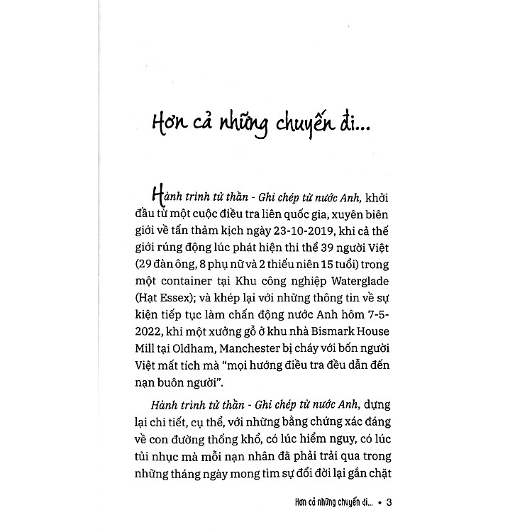 Hành Trình Tử Thần Ghi Chép Từ Nước Anh bắt đầu từ một cuộc điều tra liên quốc gia về một thảm kịch đã xảy ra vào ngày 23-10-2019, khi một sự kiện bi thảm đã khiến cả thế giới phải chú ý. Cuốn sách không chỉ đơn thuần là ghi chép lại sự kiện mà còn là một hành trình tìm hiểu sâu sắc về nguyên nhân, hậu quả và những trải nghiệm của những người sống sót. Tác giả đưa ra những góc nhìn độc đáo về cách mà xã hội và con người đã phản ứng trước nỗi đau, thảm họa, và cả những bài học quý giá mà chúng ta có thể rút ra từ đó.
