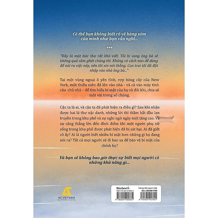 Hung Thủ Quen Mặt là một tác phẩm trinh thám hấp dẫn của tác giả Shari Lapena, được dịch giả Thanh Hoa mang đến độc giả Việt Nam. Sách được phát hành bởi nhà xuất bản Văn học, dưới thương hiệu Mintbooks, với kích thước 14,5 x 20,5 cm. Giá bìa của cuốn sách này là 138.000 VNĐ.
