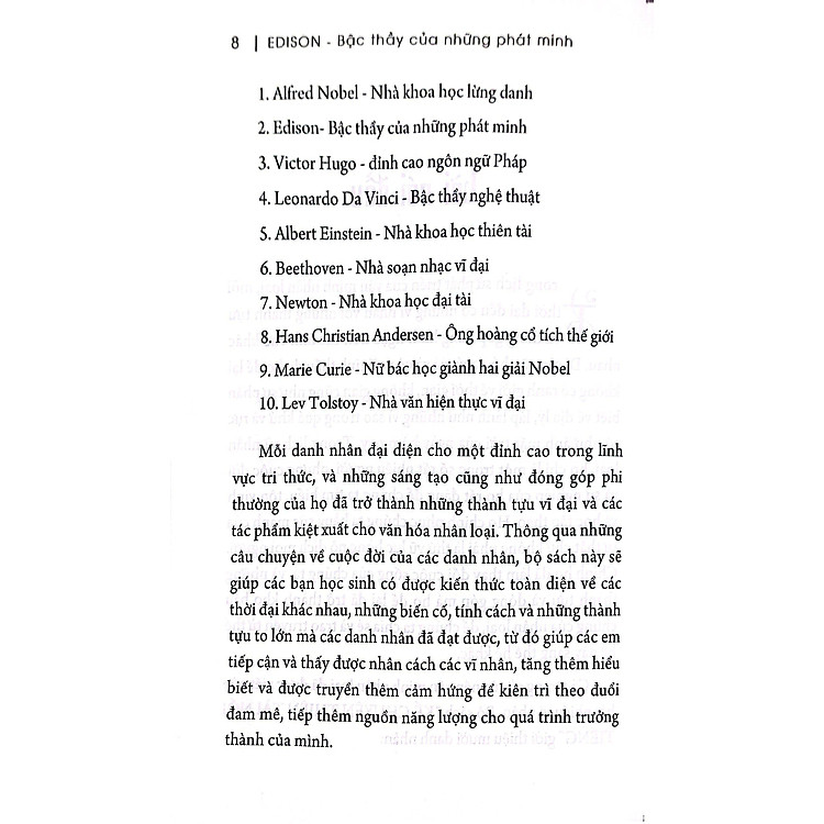 - Nội dung: Giới thiệu về các danh nhân nổi tiếng như Alfred Nobel, Edison, Victor Hugo, Leonardo Da Vinci.