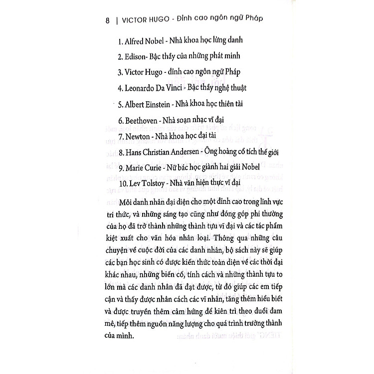 - Nội dung: Giới thiệu về các danh nhân nổi tiếng như Alfred Nobel, Edison, Victor Hugo, Leonardo Da Vinci.