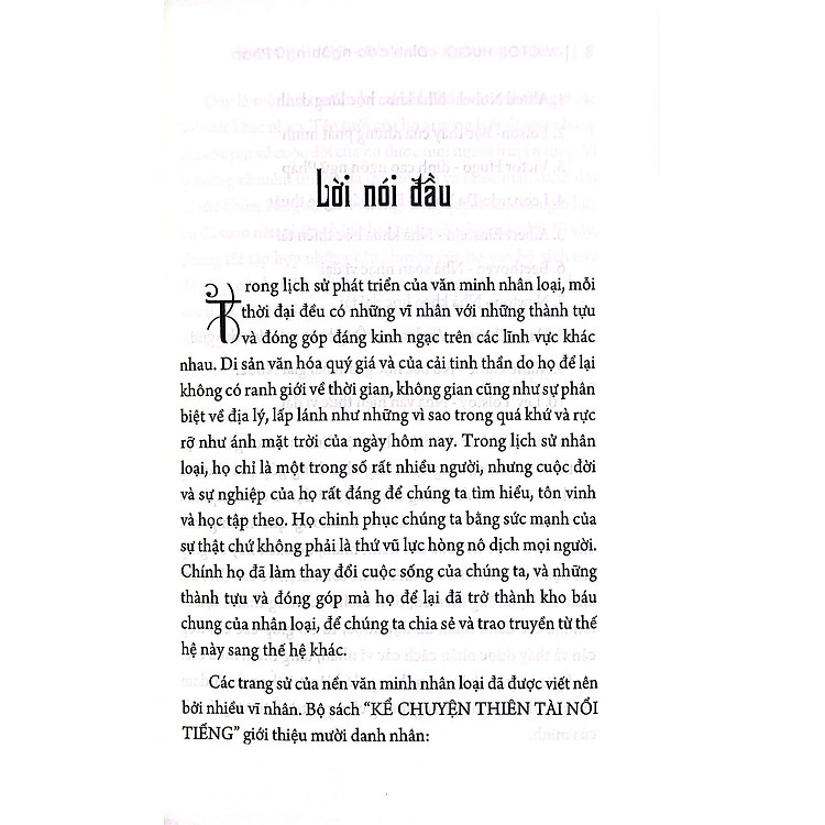 “Kể Chuyện Thiên Tài Nổi Tiếng” không chỉ là một tác phẩm văn học, mà còn là một bảng tóm tắt sống động về những cuộc đời đáng ngưỡng mộ. Victor Hugo đã khéo léo khắc họa những câu chuyện của các nhân vật nổi tiếng như Edison, Victor Hugo, Leonardo Da Vinci và nhiều người khác. Qua từng trang sách, bạn sẽ khám phá được những khó khăn, thử thách mà họ đã vượt qua để trở thành những thiên tài trong lĩnh vực của mình. Tác phẩm này không chỉ đem đến cho bạn những bài học quý giá mà còn kích thích tinh thần cầu tiến, giúp bạn nhìn nhận cuộc sống với nhiều góc độ mới mẻ.