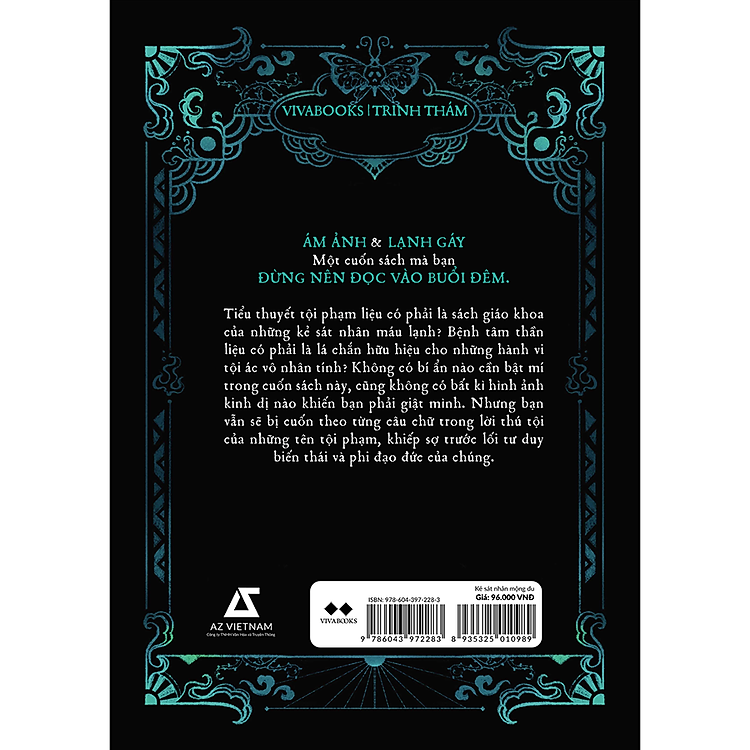 Bìa đẹp, bling bling. Mình thích mấy kiểu giúng dị, nhìn sang vl luôn. Nội dung cũng được. Sách mỏng nên đọc nhanh. Những vụ án giết người cũng bth, cách thức như bóp cổ đến chết hoặc dùng súng, dùng dao. K đặc sắc lắm vs mình, k có gì đẫm máu hay kinh dị ở đây cả. Tâm lý nv cũng k méo mó vặn vẹo j luôn. Đọc cũng được hoyy
