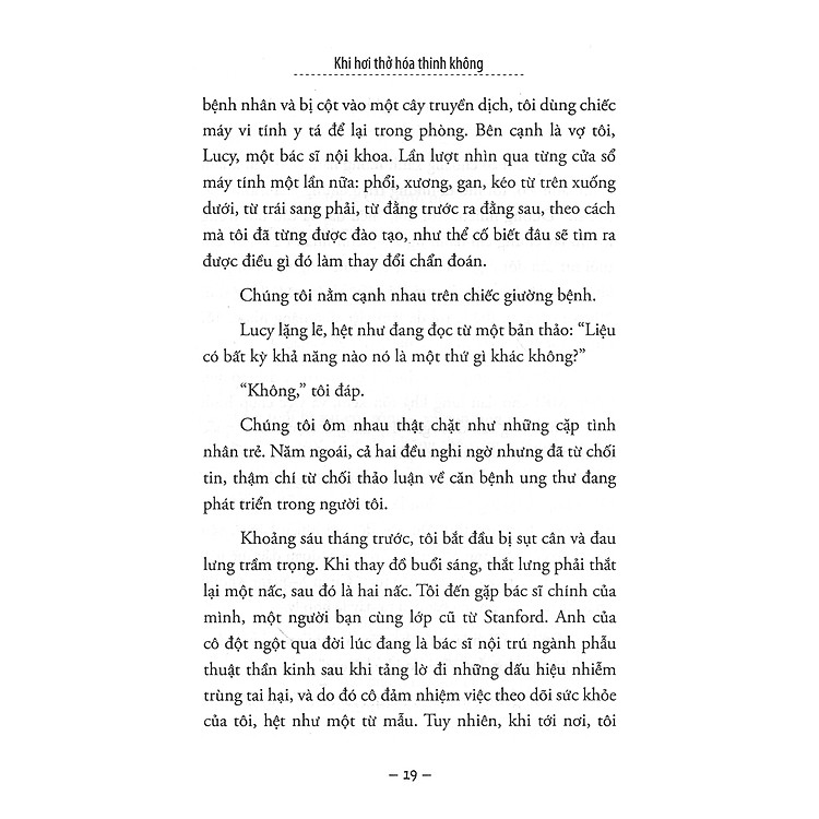 Có bao giờ bạn tự hỏi, nếu một ngày hơi thở của bạn ngừng lại, bạn sẽ cảm nhận như thế nào? Cuộc sống đôi khi mang đến những điều không lường trước được, và chính trong những khoảnh khắc ấy, chúng ta mới thật sự hiểu giá trị của cuộc sống. Khi Hơi Thở Hóa Thinh Không không chỉ là một cuốn sách, mà là một hành trình đầy cảm xúc của tác giả, một bác sĩ đương đầu với căn bệnh ung thư phổi. Cuốn sách này sẽ giúp bạn nhìn nhận lại cuộc sống, hiểu rõ hơn về sự sống và cái chết, cũng như những điều quý giá mà ta thường bỏ lỡ.