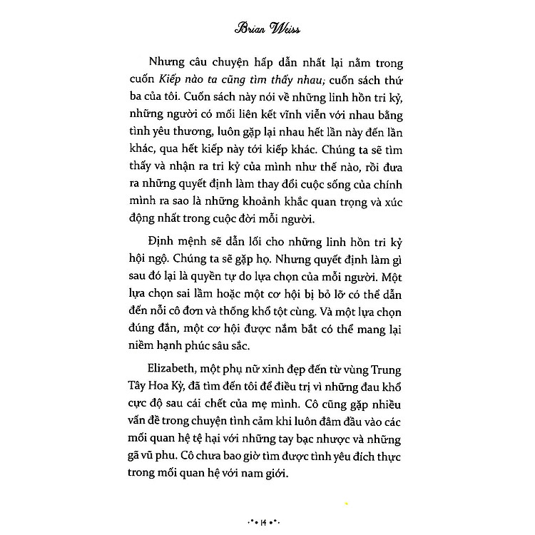 Kiếp Nào Ta Cũng Tìm Thấy Nhau là tác phẩm thứ ba của bác sĩ tâm thần học Brain L. Weiss, người nổi tiếng với những nghiên cứu về hồi quy kiếp trước. Cuốn sách không chỉ đơn thuần kể về những trải nghiệm tâm linh mà còn là một hành trình giúp bạn hiểu rõ hơn về lý do chúng ta gặp gỡ nhau trong cuộc sống này. Tác giả chia sẻ những câu chuyện đầy cảm xúc, những cuộc gặp gỡ kỳ lạ và những bài học sâu sắc mà chúng ta có thể rút ra từ chúng.