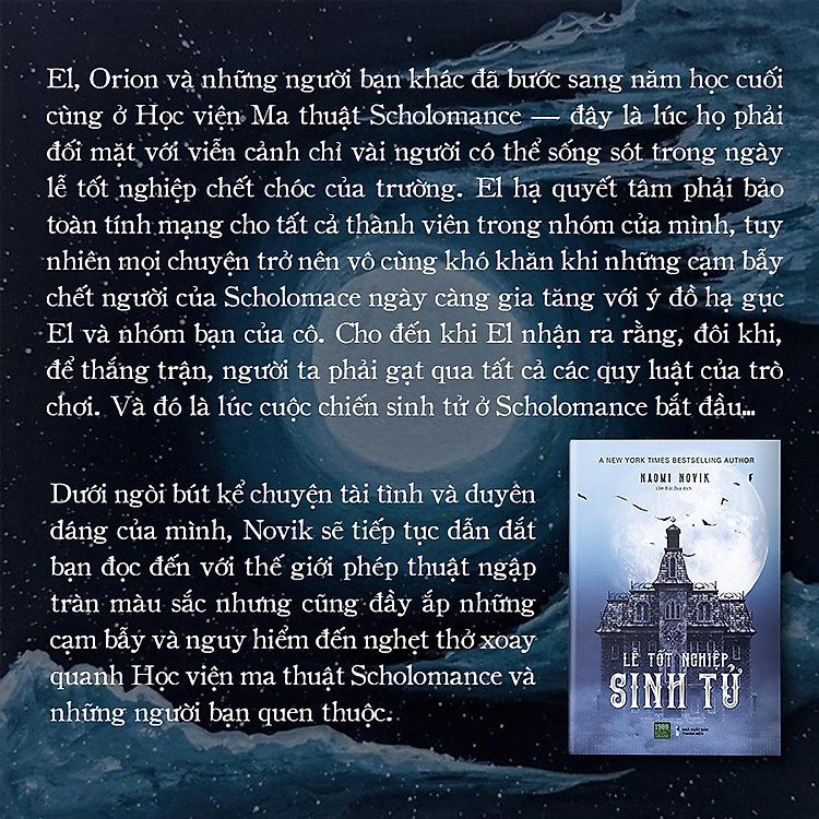 Mua Lễ Tốt Nghiệp Sinh Tử là một tác phẩm nổi bật của tác giả Naomi Novik, được dịch bởi Lâm Đức Duy. Cuốn sách không chỉ mang đến những câu chuyện hấp dẫn mà còn khắc họa sâu sắc những chủ đề về cuộc sống và cái chết, tình bạn và sự hy sinh. Qua những trang sách, độc giả sẽ được lạc vào một thế giới kỳ diệu, nơi mà những nhân vật đầy màu sắc và những tình huống gay cấn khiến bạn không thể rời mắt.