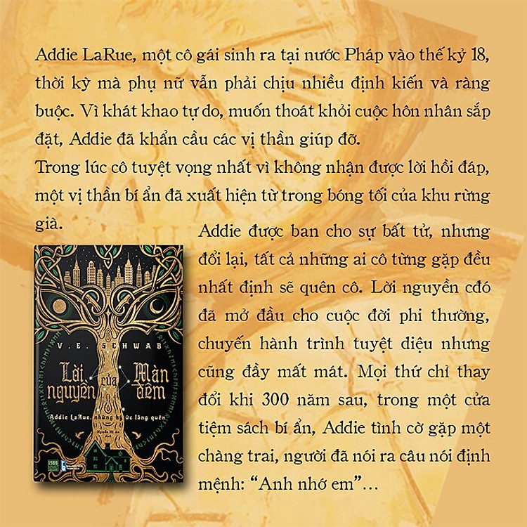 Mua Lời Nguyền Của Màn Đêm là một tác phẩm nổi bật trong dòng văn học hiện đại, đặc biệt là dành cho những ai yêu thích thể loại giả tưởng. Cuốn sách kể về cuộc đời của Addie LaRue, một cô gái trẻ sinh ra tại nước Pháp vào thế kỷ 18, thời kỳ mà phụ nữ còn phải đối mặt với nhiều định kiến và hạn chế trong xã hội. Thông qua câu chuyện của Addie, tác giả đã khéo léo lồng ghép những chủ đề về tự do, bản sắc và sức mạnh của tình yêu.