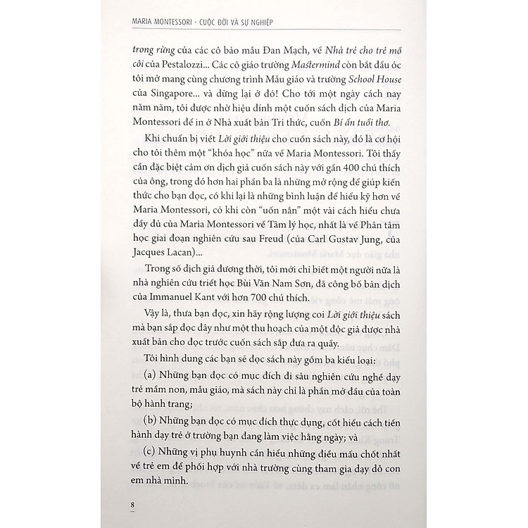 Maria Montessori – Cuộc Đời Và Sự Nghiệp không chỉ đơn thuần là một bản tóm tắt về cuộc đời của bà, mà còn là một cái nhìn sâu sắc về những nguyên tắc giáo dục mà bà đã xây dựng. Cuốn sách dẫn dắt độc giả qua từng giai đoạn quan trọng trong cuộc đời của Maria Montessori, từ những năm tháng đầu đời đến những thành tựu vĩ đại trong nghề giáo dục. Bằng cách khám phá những thử thách và thành công của bà, độc giả sẽ thấy được tầm quan trọng của việc tôn trọng trẻ em và tạo ra môi trường học tập thân thiện.