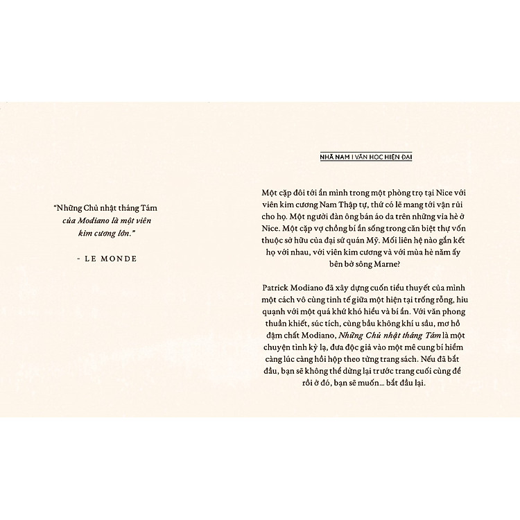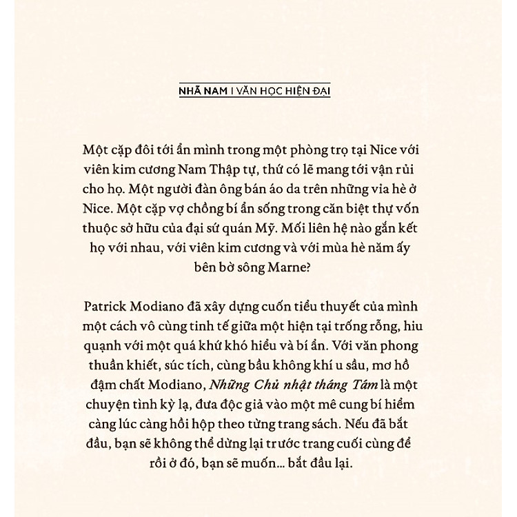 “Những Chủ Nhật Tháng Tám” của tác giả Patrick Modiano là một tác phẩm mang đậm dấu ấn cá nhân và tâm trạng. Cuốn sách kể về những ngày Chủ Nhật ảm đạm của một nhân vật đang tìm kiếm ký ức của chính mình. Trong hành trình này, nhân vật không chỉ phải đối diện với những kỷ niệm đau thương mà còn phải tìm cách kết nối lại với những người đã từng quan trọng trong cuộc đời mình. Patrick Modiano, với lối kể chuyện tinh tế, đã khéo léo dẫn dắt người đọc vào thế giới của những ký ức mờ nhạt và những mối liên kết tình cảm đầy phức tạp.