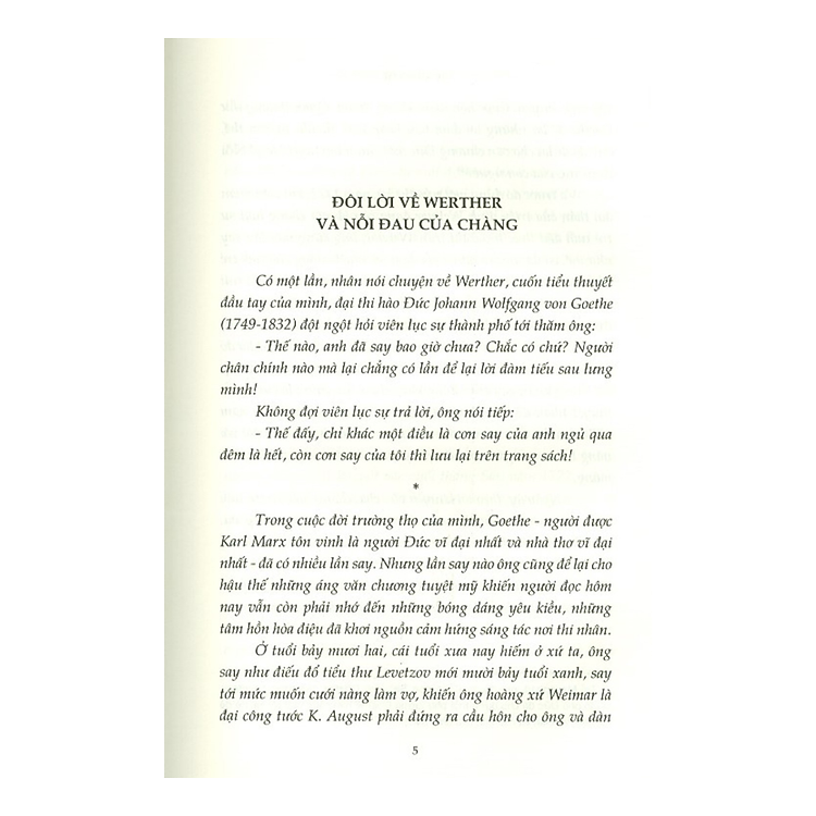Sách đẹp về hình thức. Nội dung theo ý kiến mình phù hợp với từng người, và với mình thì nó ko đem lại cho mình nhiều ý nghĩa lắm. Nội dung nói về tâm tư của một người con trai thất tình, rồi tự kết thúc cuộc đời mình. Câu truyện diễn ra trong bối cảnh nước Đức, thế kỷ XVII-XVIII.