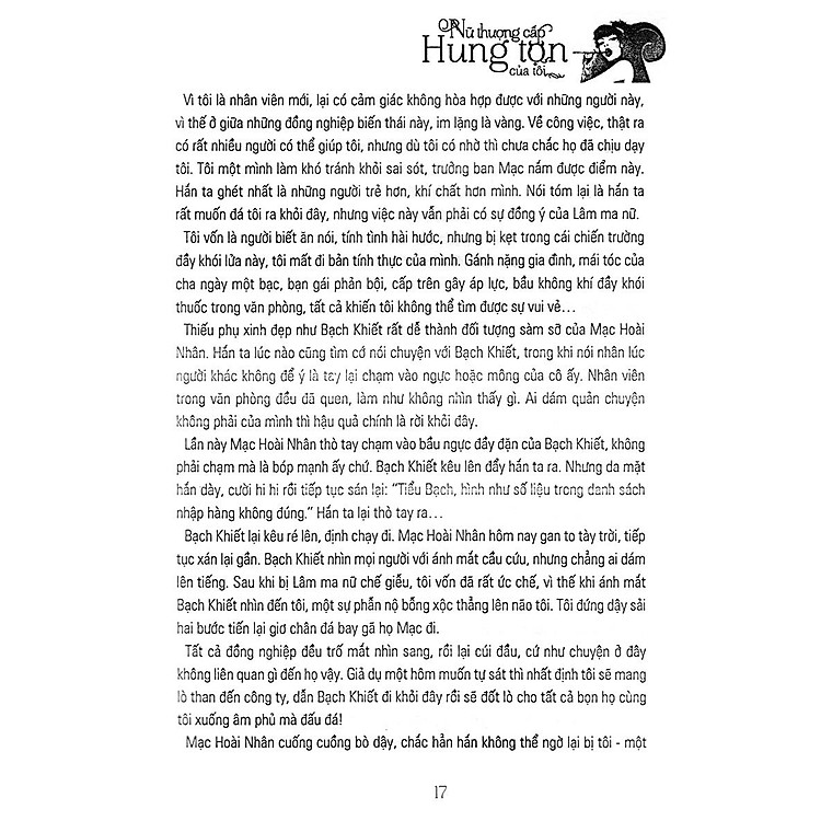 Trong thời đại mà tình yêu dường như trở nên rẻ mạt, liệu có ai từng đặt câu hỏi rằng liệu bản thân có trở nên lạnh lùng, vô cảm hay không? Cuốn sách Nữ Thượng Cấp Hung Tợn Của Tôi chính là một bức tranh sống động về những cảm xúc phức tạp trong tình yêu và công việc mà nhiều người trẻ đang trải qua. Cuốn sách này sẽ giúp bạn nhìn nhận lại giá trị của tình yêu và lòng tin trong cuộc sống đầy cạnh tranh này.