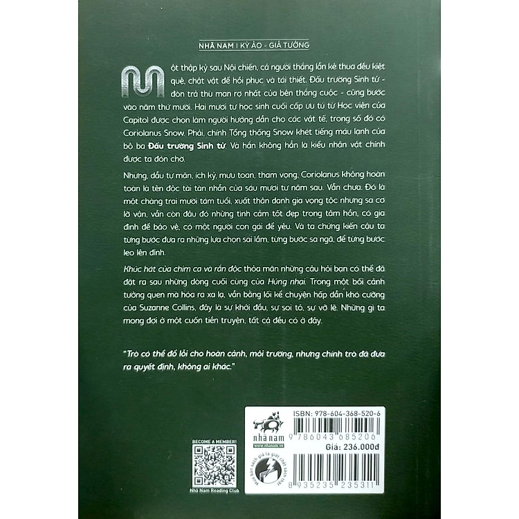 “Khúc Hát Của Chim Ca Và Rắn Độc” tiếp tục đưa người đọc vào những cuộc chiến khốc liệt, nơi mà từng quyết định có thể dẫn đến sự sống hay cái chết. Tác giả đã khéo léo xây dựng một thế giới đầy bí ẩn và kịch tính, nơi mà cái thiện và cái ác luôn đan xen, tạo nên những tình huống bất ngờ và khó lường. Các nhân vật chính đều mang trong mình những bí mật, khát vọng và nỗi đau riêng, khiến độc giả không thể rời mắt khỏi từng trang sách.