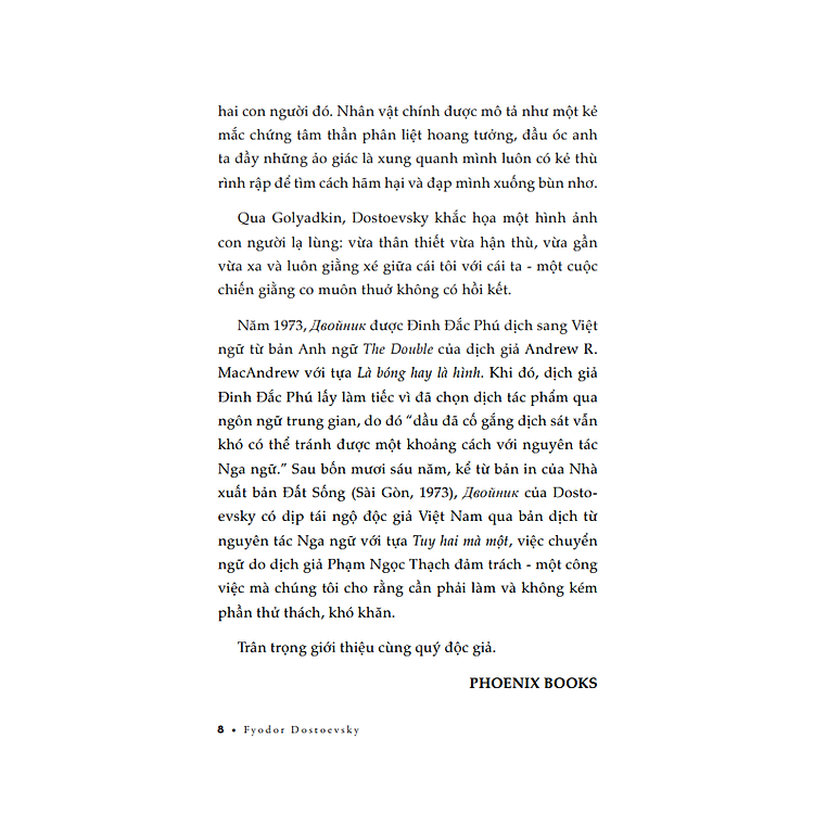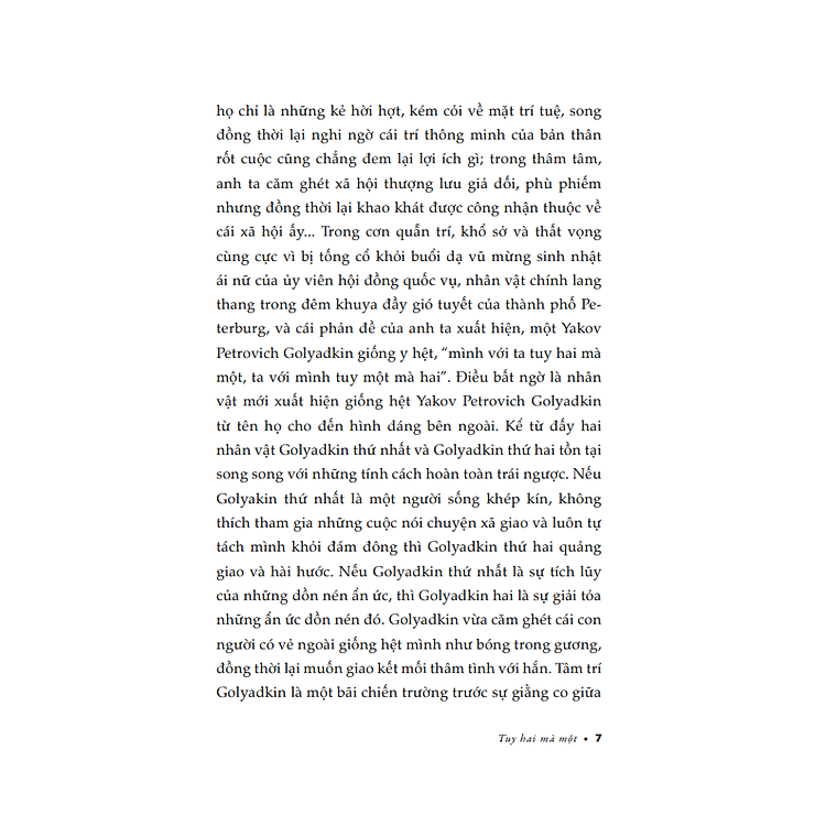 Tuy Hai Mà Một là một tác phẩm của Fyodor Dostoevsky, một trong những nhà văn vĩ đại nhất của nền văn học Nga. Ông đã để lại dấu ấn sâu sắc trong lòng người đọc với những tác phẩm phản ánh sâu sắc tâm lý và xã hội. Với trí tuệ sắc bén và cái nhìn thấu hiểu về con người, Dostoevsky đã khéo léo lồng ghép triết lý và nhân sinh vào trong từng câu chữ, khiến cho tác phẩm của ông luôn có giá trị vượt thời gian.