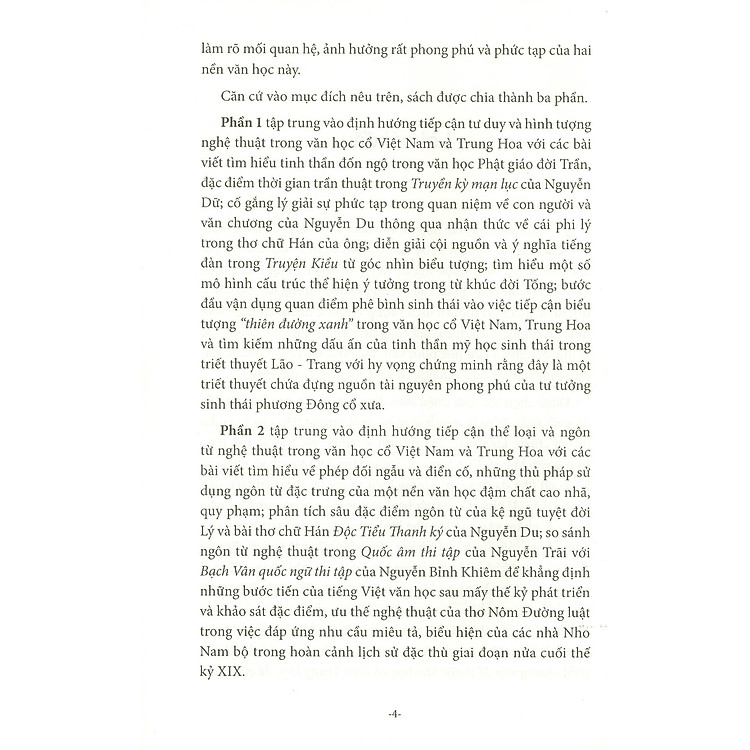 “Văn Học Cổ Việt Nam Và Trung Hoa – Những Hướng Tiếp Cận” là một tập hợp những bài viết và tham luận đã được công bố trong suốt 10 năm qua, từ các tạp chí khoa học cho đến kỷ yếu hội thảo. Cuốn sách không chỉ là một tuyển tập những nghiên cứu, mà còn là cầu nối giữa quá khứ và hiện tại, giữa hai nền văn học lớn. Độc giả sẽ thấy rõ những cách tiếp cận khác nhau trong việc nghiên cứu văn học, từ ngữ nghĩa cho đến những giá trị văn hóa mà văn học mang lại. Qua đó, cuốn sách mở ra một không gian để độc giả khám phá và cảm nhận sâu sắc hơn về di sản văn hóa của tổ tiên.