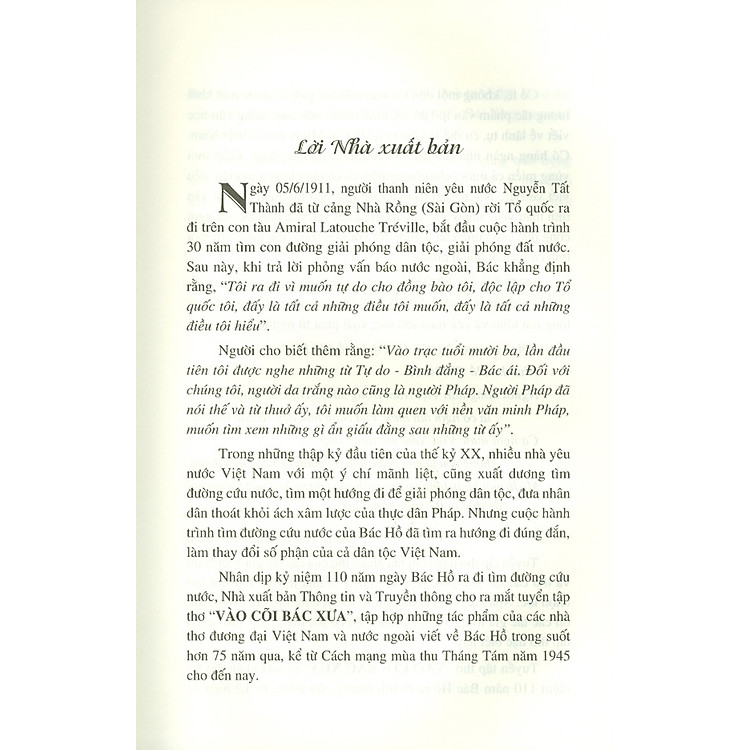 Mua Vào Cõi Bác Xưa là một tuyển thơ đặc biệt, nơi hội tụ 141 tác phẩm của 115 nhà thơ đương đại, cả trong nước và quốc tế, viết về Bác Hồ. Tuyển tập này không chỉ là một tác phẩm văn học mà còn là một hành trình trở về với những giá trị lịch sử và văn hóa của dân tộc Việt Nam.