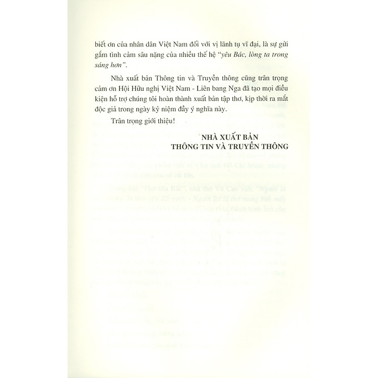 Ngoài ra, phần cuối của tuyển tập còn có những bài viết phân tích và bình luận về tác phẩm, giúp người đọc hiểu sâu hơn về ý nghĩa và bối cảnh ra đời của mỗi bài thơ. Đây chính là cơ hội để những ai yêu thích văn học và lịch sử tìm hiểu thêm về tư tưởng và cuộc đời của Bác Hồ qua lăng kính nghệ thuật. Hãy đến Bảo Châu Books để sở hữu Mua Vào Cõi Bác Xưa (Bìa Cứng) và cùng trải nghiệm những cảm xúc thiêng liêng mà tuyển tập này mang lại!