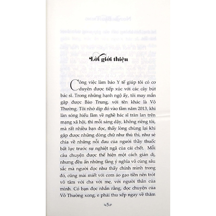 Mình vô tình biết đến tác giả khi đang tìm những cuốn sách liên quan đến ngành y. Đối với mình đây thực sự là một món quà khi biết đến một tác giả tuyệt vời như vậy. Bs Nguyễn Bảo Trung không phải là một nhà văn nhưng là một người có khả năng sống và cố gắng sống cho thật trọn vẹn, chính điều đó đã biến một bác sĩ đồng thời cũng trở thành một nghệ sĩ. Những gì tác giả chia sẻ thông qua những cuốn sách của mình vô cùng chân thật và có công năng nuôi dưỡng, chữa lành rất lớn. Đó là những trải nghiệm với đôi mắt cố gắng mở thật to và nhìn thật sâu sắc. Xin biết ơn và trân quý.