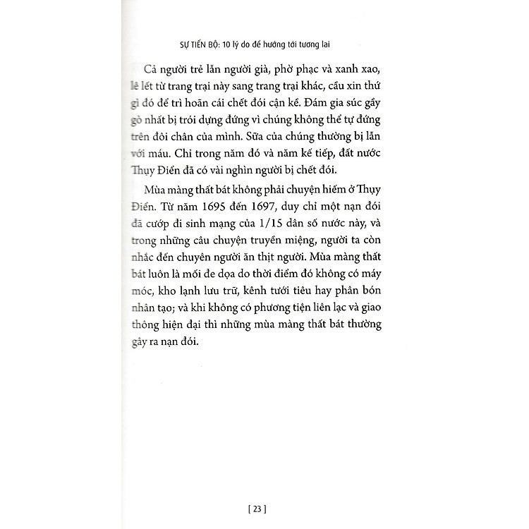 Nói nôm na là, cuốn sách tập trung vào việc chứng minh rằng mặc dù có vô vàn khó khăn, chúng ta vẫn đang tiến bộ mạnh mẽ. Johan Norberg phân tích sâu sắc 10 lĩnh vực khác nhau, từ thực phẩm, vệ sinh, tuổi thọ cho đến bình đẳng và môi trường. Ông nhấn mạnh rằng ngày nay, chúng ta sống trong thời kỳ hoàng kim, với mức sống cao hơn và những chỉ số xã hội khả quan hơn bao giờ hết. Thật không thể tin nổi rằng tỷ lệ biết chữ đã tăng từ 20% lên 85% chỉ trong một thế kỷ!
