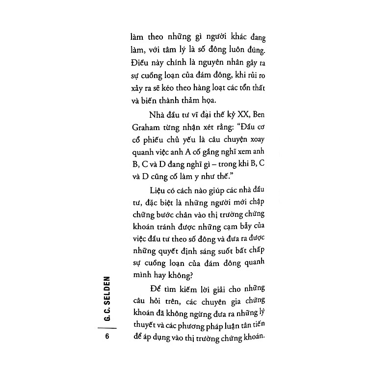 Bên cạnh đó, Tâm Lý Thị Trường Chứng Khoán cũng giúp người đọc nhận thức được tâm lý đám đông, điều mà rất nhiều nhà đầu tư dễ dàng bỏ qua. G.C. Selden đã chỉ ra rằng việc hiểu rõ tâm lý đám đông sẽ mở ra cánh cửa cho bạn khám phá những điều thú vị và bí mật ẩn giấu trong trò chơi kinh doanh vĩ đại nhất mọi thời đại.