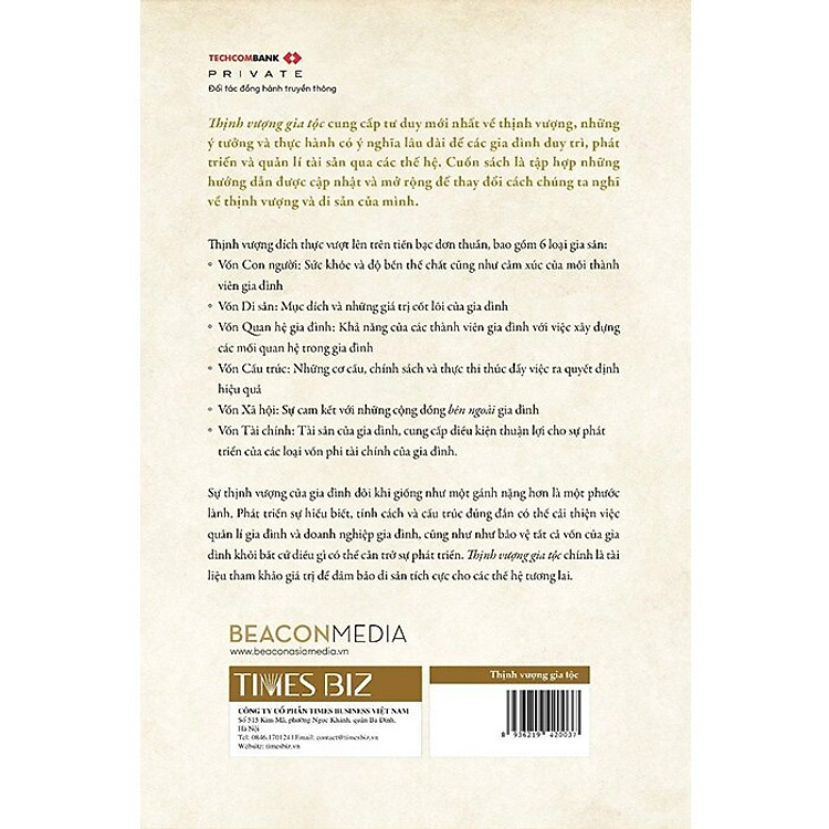 Thịnh Vượng Gia Tộc mang đến cho độc giả một cái nhìn sâu sắc về việc duy trì và phát triển tài sản gia đình. Tác phẩm này trình bày các khái niệm và thực hành cần thiết để không chỉ bảo toàn tài sản tài chính mà còn xây dựng những giá trị phi tài chính – chẳng hạn như sức khỏe, mối quan hệ gia đình, và di sản văn hóa. Cuốn sách khuyến khích độc giả khám phá sáu loại vốn cốt lõi, bao gồm: vốn con người, vốn di sản, vốn quan hệ gia đình, vốn cấu trúc, vốn xã hội và vốn tài chính. Mỗi loại vốn này đều có vai trò quan trọng trong việc tạo dựng thịnh vượng bền vững cho gia đình.