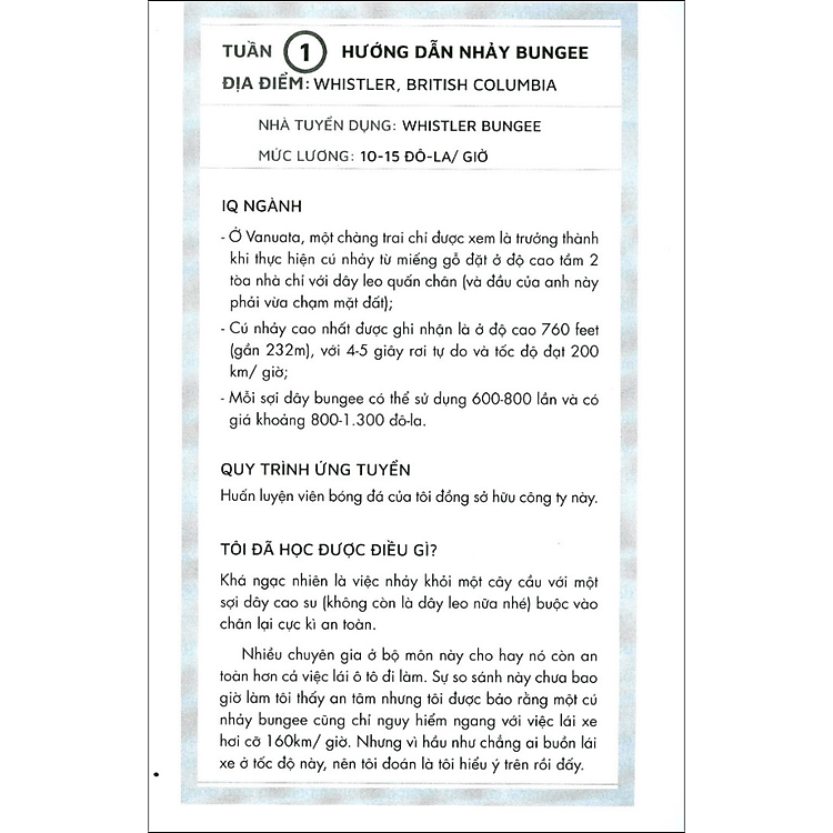 Cuốn sách này kể về hành trình của Sean Aiken, một chàng trai trẻ vừa tốt nghiệp nhưng lại lạc lối trong sự nghiệp của mình. Anh đã quyết định thực hiện một dự án táo bạo: mỗi tuần thử sức với một nghề khác nhau trong suốt 52 tuần. Từ việc làm phục vụ bàn cho đến bán hàng, mỗi công việc đều mang đến cho anh những trải nghiệm, bài học và sự trưởng thành. Hành trình này không chỉ giúp Sean tìm ra con đường mình thực sự muốn đi, mà còn mở ra những cơ hội bất ngờ mà anh chưa từng nghĩ tới.