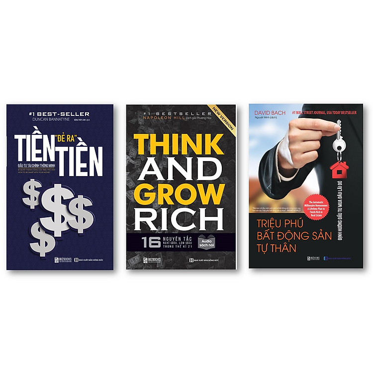 - Combo sách bao gồm “Tiền Đẻ Ra Tiền”, “Triệu Phú Bất Động Sản Tư Thân” và “Think and Grow Rich”.
