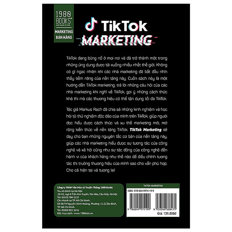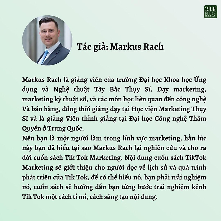 Nói nôm na là, cuốn sách hướng dẫn bạn cách thức để khai thác tối đa tiềm năng của TikTok trong lĩnh vực marketing. Nó giúp bạn hiểu rõ hơn về cách mà các thương hiệu lớn như Nike hay Dolce & Gabbana đã sử dụng TikTok để nâng cao nhận diện thương hiệu của họ. Tác giả Markus Rach không chỉ chia sẻ kinh nghiệm cá nhân, mà còn đưa ra những chiến lược cụ thể để bạn có thể tự tin áp dụng vào công việc của mình.