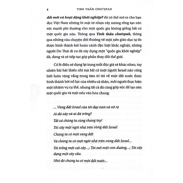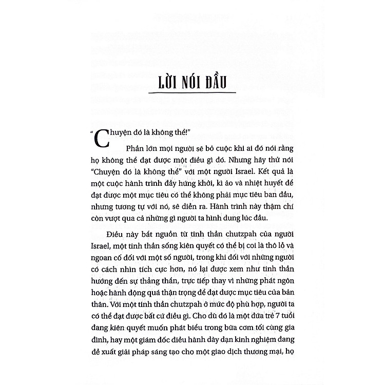 “Tinh Thần Chutzpah” không chỉ là một cuốn sách, mà là một hành trình khám phá tâm hồn và tri thức của một quốc gia đầy sáng tạo. Bạn sẽ nhận ra rằng, sự đổi mới không chỉ nằm ở công nghệ, mà còn ở cách mà chúng ta tư duy và hành động trong cuộc sống hàng ngày.