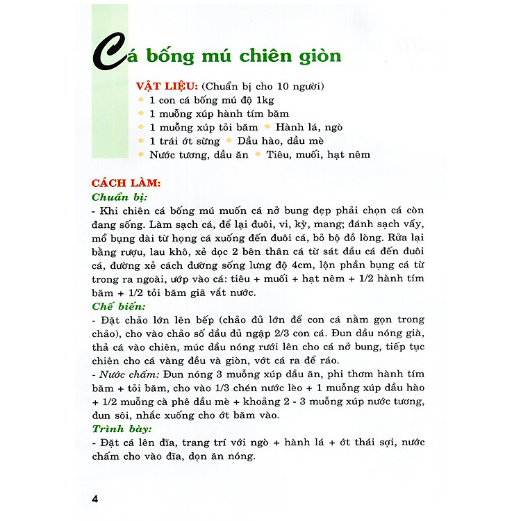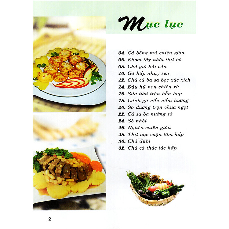 - Danh sách món ăn: Gồm 30 món đa dạng như cá bống mú chiên giòn, khoai tây nhồi thịt bò, và chả giò hải sản.