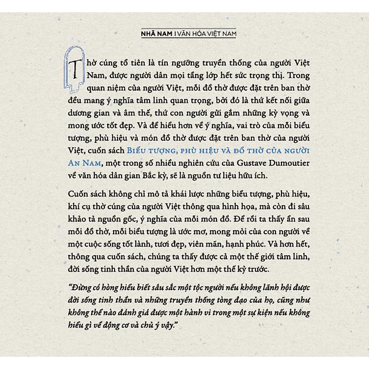 Thờ cúng tổ tiên là tín ngưỡng truyền thống của người Việt Nam, được người dân mọi tầng lớp hết sức trọng thị. Trong quan niệm của người Việt, mỗi đồ thờ được đặt trên ban thờ đều mang ý nghĩa tâm linh quan trọng, bởi đó là thứ kết nối giữa dương gian và âm thế, thứ con người gửi gắm những kỳ vọng và mong ước tốt đẹp. Và để hiểu hơn về ý nghĩa, vai trò của mỗi biểu tượng, phù hiệu và món đồ thờ được đặt trên ban thờ của người Việt, cuốn sách BIỂU TƯỢNG, PHÙ HIỆU VÀ ĐỒ THỜ CỦA NGƯỜI AN NAM, một trong số nhiều nghiên cứu của Gustave Dumoutier về văn hóa dân gian Bắc kỳ, sẽ là nguồn tư liệu hữu ích.