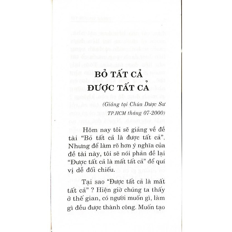 Hôm nay tôi sẽ giảng về đề tài “Bỏ tất cả là được tất cả”. Nhưng để làm rõ hơn ý nghĩa của đề tài này, tôi sẽ nói phản đề lại “Được tất cả là mất tất cả” để quí vị dễ đối chiếu.