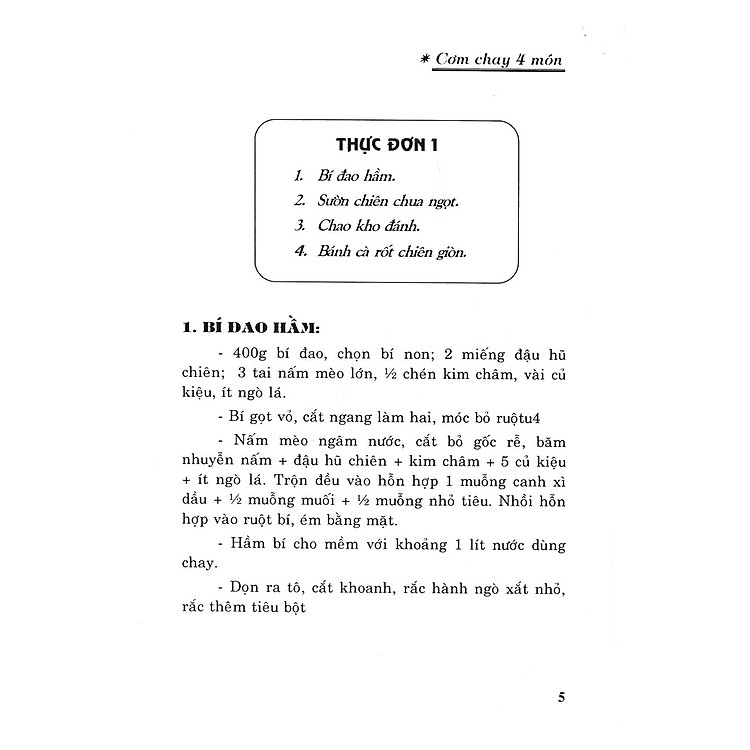 CƠM CHAY BỐN MÓN giới thiệu 30 Thực Đơn Chay hàng ngày để các bạn tiện lựa chọn cho phù hợp với khẩu vị và khẩu phần gia đình, cũng như cách chế biến. Ngoài ra, sách còn giới thiệu các Món Ăn Lẻ như: hủ tiếu; bún ốc; bún riêu; dưa mắm… và mục Tư Vấn Gia Chánh.