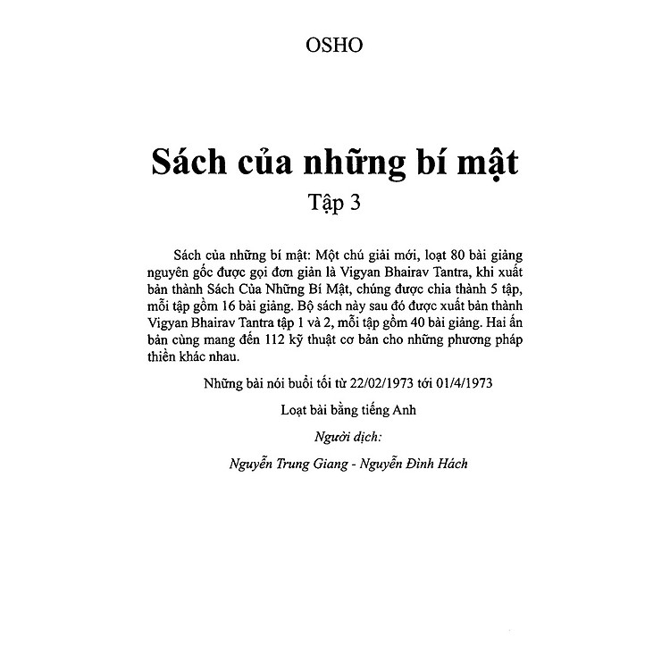 Bộ sách này được nhiều người coi là một trong những cuốn sách quan trọng nhất của Osho. Vigyan Bhairav Tantra nay được phát hành dưới tên SÁCH CỦA NHỮNG BÍ MẬT, trọn bộ 5 tập, mỗi tập gồm 16 chương.