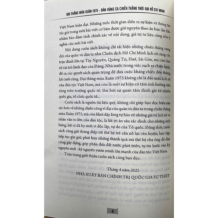 Cuốn sách là nguồn tài liệu quý, giúp bạn đọc hiểu sâu sắc hơn về những chiến công vĩ đại của quân và dân ta trong chiến thắng mùa Xuân 1975; khơi dậy lòng tự hào về những giá trị lịch sử và nhân văn to lớn của dân tộc, là lời tri ân sâu sắc dành cho những anh hùng, liệt sĩ đã hy sinh vì độc lập, tự do của Tổ quốc.