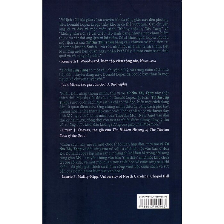 “Về lịch sử Phật giáo và sự truyền bá của tông giáo này đến phương Tây, Donald Lopez là bậc thầy khó ai có thể vượt qua. Câu chuyện ông kể ra đây về một cuốn sách “không thật sự Tây Tạng” và “không hẳn nói về cái chết” lấp lánh bằng những nét châm biếm thú vị và các đối ứng lịch sử lôi cuốn. Có ai khác ngoài Lopez bắt đầu một lịch sử của Tử thư Tây Tạng bằng câu chuyện về nhà tiên tri Mormon Joseph Smith – và rồi, như một nhà văn trinh thám, tiết lộ những mối liên quan ngay phần kết? Đây là một cuốn sách tinh quái và vô cùng hấp dẫn.” – K I. Woodward, biên tập viên cộng tác, Neusueek