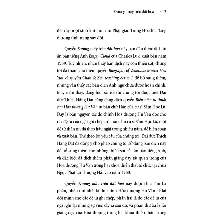 Quyển “Đường mây trên đất hoa” ban đầu được dịch từ ấn bản tiếng Anh “Emty Cloud” của Chales Luk, xuất bản năm 1959. Tuy nhiên, nhận thấy bản dịch này còn thiếu sót, dịch giả Nguyên Phong (GS. John Vu) đã dày công tham cứu thêm quyển “Biography of Venerable Master Hsu Yun”, quyển “Chan & Zen teaching Series 1” để bổ sung thêm. Đặc biệt, giáo sư đã xin phép và tham khảo cuốn sách “Biên niên tự thuật của Hòa thượng Hư Vân” (bản nguyên tác chữ Hán được cư sĩ Sầm Học Lữ – đệ tử thân tín theo hầu hòa thượng Hư Vân trong nhiều năm, trực tiếp ghi chép từ lời của hòa thượng Hư Vân) được hòa thượng Thích Hằng Đạt công phu biên dịch.