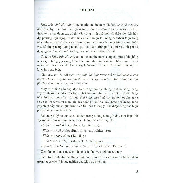 Kiến trúc sinh khí hậu là kiến trúc có xem xét đến điều kiện khí hậu của địa điểm, trong tác động tới con người, nhờ đó thiết kế và xây dựng các đô thị, các công trình phù hợp với điều kiện khí hậu địa phương, tân dụng tối đa thiên nhiên thuận lợi, nâng cao điều kiện sống tiện nghi và bảo vệ sức khỏe cho con người trong các ông trình, giảm thiểu việc sử dụng năng lượng nhân tạo, tiết kiệm kinh phí đầu tư và kinh phí sử dụng, giảm ô nhiễm môi trường, bảo vệ hệ sinh thái trái đất.Giá sản phẩm trên Tiki đã bao gồm thuế theo luật hiện hành. Bên cạnh đó, tuỳ vào loại sản phẩm, hình thức và địa chỉ giao hàng mà có thể phát sinh thêm chi phí khác như phí vận chuyển, phụ phí hàng cồng kềnh, thuế nhập khẩu (đối với đơn hàng giao từ nước ngoài có giá trị trên 1 triệu đồng)…..