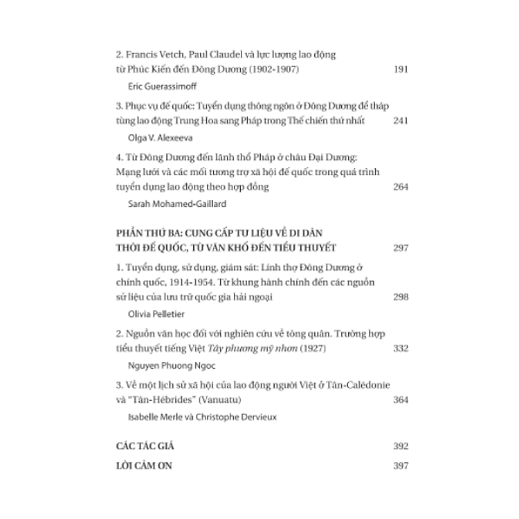 Mỗi chuyên khảo trong cuốn sách này xứng đáng là trang viết tỉ mẩn về một chương đoạn trong lịch sử kinh tế và xã hội Việt Nam: sự di cư của một cộng đồng gồm đàn ông, phụ nữ và đôi khi cả trẻ em, quá trình tổ chức di cư đó, từ tuyển mộ tới hồi hương, bối cảnh lao động và quản lý lao động. Cho dù điểm đến là một đồn điền ở Việt Nam, một hầm mỏ ở Tân-Calédonie hay một nhà máy ở Pháp thì những nghiên cứu này vẫn là đóng góp quan trọng cho lịch sử di dân và lịch sử lao động.