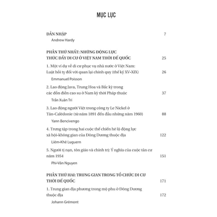 - Nội dung chính: Bao gồm 12 tiểu luận từ các nhà Việt Nam học hàng đầu về các cuộc di cư trong lịch sử Việt Nam thời Pháp thuộc.