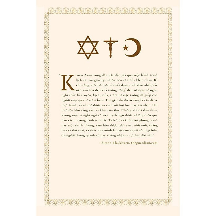 “Karen Armstrong dẫn dắt độc giả qua một hành trình lịch sử tôn giáo tại nhiều nền văn hóa khác nhau. Bà cho rằng, từ rất xưa và dưới dạng tinh khôi nhất, các nền văn hóa đều khá tương đồng nhau, đều sử dụng lễ nghi, nghi thức bí truyền, kịch, múa, trầm tư mặc tưởng để giúp con người vượt qua bể trầm luân. Tôn giáo, do đó, rõ ràng là vấn đề về thực hành, và có thể được so sánh với hội họa hay âm nhạc. Hai thứ đều khó sáng tác, và khó cảm thụ. Nhưng khi đã dấn thân, không một ai nghi ngờ về việc hạnh ngộ được những điều quý báu xảy ra trong hành trình ấy. Ta bước ra khỏi một phòng tranh hay một thính phòng, tâm hồn được tưới tắm, tươi mới, thăng hoa và thư thái, và như mình là một con người tốt đẹp hơn, dù người chung quanh có hay không nhận ra sự thay đổi này.” – Simon Blackburn,
