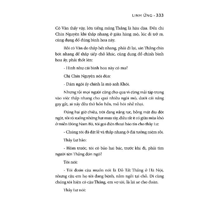 Với ngòi bút của một nhà văn từng đứng sau nhiều kịch bản phim truyền hình lẫn điện ảnh nổi tiếng, Linh Ứng hiện lên như những thước phim ly kỳ, sống động mà vẫn giàu tính hiện thực, nặng trĩu những hồi ức mà vẫn nóng hổi tính thời sự. Có nhìn thấy nỗi đau quá khứ mới trân trọng bình yên của hiện tại, có nhìn thấy sự tồn tại của những cõi giới khác mới nhận thấy được vị trí khiêm tốn của con người trong thế giới bao la. Linh Ứng chính là câu chuyện của hôm qua, hôm nay và cả ngày sau.