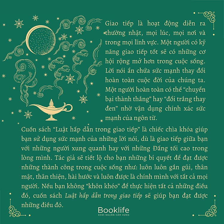 Nếu bạn nỗ lực và kiên trì, Luật hấp dẫn sẽ giúp bạn cải thiện cách giao tiếp để thu hút được tất cả những điều tích cực nhất. Đúc kết từ những lời thực hành khẳng định cùng những bài thuyết giảng từ bậc thánh nhân trong công cuộc thu hút năng lượng tích cực từ vũ trụ, cuốn sách đóng vai trò như một ngọn hải đăng soi sáng chúng ta trên con đường đi đến tiền tài, danh vọng, và thành công trong cuộc sống thông qua giao tiếp.