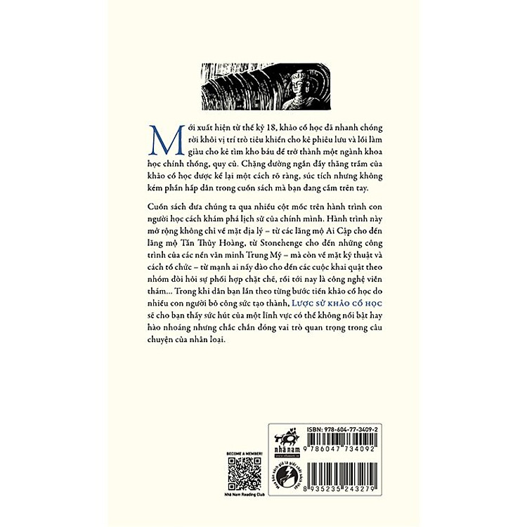 Cuốn sách đưa chúng ta qua nhiều cột mốc trên hành trình con người học cách khám phá lịch sử của chính mình. Hành trình này mở rộng không chỉ về mặt địa lý – từ các lăng mộ Ai Cập cho đến lăng mộ Tần Thủy Hoàng, từ Stonehenge cho đến những công trình của các nền văn minh Trung Mỹ – mà còn về mặt kỹ thuật và cách tổ chức – từ mạnh ai nấy đảo cho đến các cuộc khai quật theo nhóm đòi hỏi sự phối hợp chặt chẽ, rồi tới nay là công nghệ viên thám… Trong khi dẫn bạn lần theo từng bước tiến khảo cổ học do nhiều con người bỏ công sức tạo thành, LƯỢC SỬ KHẢO CỔ HỌC sẽ cho bạn thấy sức hút của một lĩnh vực có thể không nổi bật hay hào nhoáng nhưng chắc chắn đóng vai trò quan trọng trong câu chuyện của nhân loại.