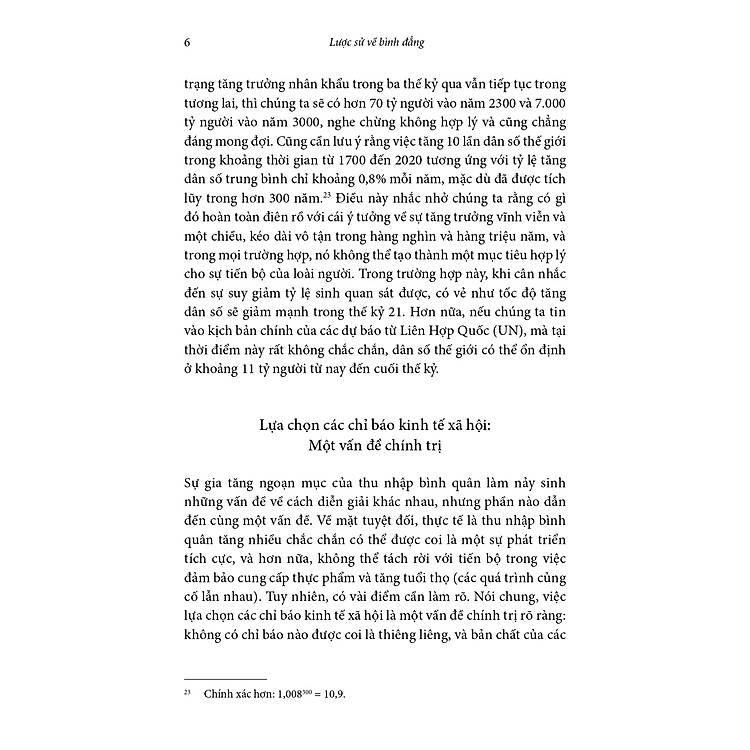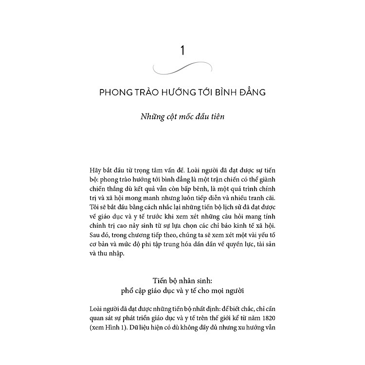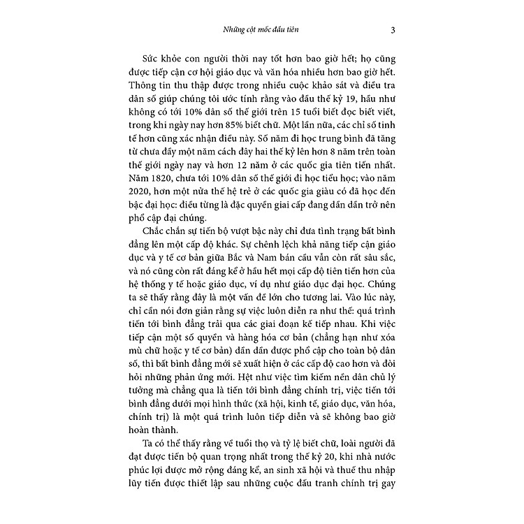 “Lược sử về bình đẳng” xoay quanh bình đẳng và bất bình đẳng trong kinh tế, thể hiện qua chính trị và các thước đo chất lượng cuộc sống con người (tuổi thọ bình quân, cơ hội giáo dục, tỉ lệ mù chữ, các quyền con người như quyền bầu cử, vân vân). Tác giả có nhận định và cái nhìn lạc quan rằng thế giới đang ngày càng bình đẳng hơn, giải thích bằng sự xuất hiện ngày càng phổ biến của thuế luỹ tiến trên thu nhập và tài sản, cũng như phúc lợi xã hội toàn diện.