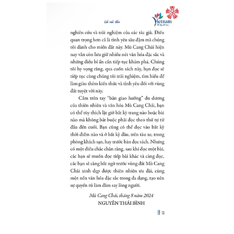 Cầm trên tay “bản giao hưởng” du dương của thiên nhiên và văn hóa Mù Cang Chải, bạn có thể tùy thích lật giở bất kỳ trang nào hoặc bài nào mà không bắt buộc phải đọc theo thứ tự từ đầu đến cuối. Bạn cũng có thể đọc vào bất kỳ thời điểm nào và ở bất kỳ đâu, trên tàu xe, trong phòng khách sạn, hay trước bàn đọc sách. Nhưng có một điều chắc chắn rằng, sau khi đọc một bài, các bạn sẽ muốn đọc tiếp bài khác và càng đọc, các bạn sẽ càng bất ngờ trước vùng đất Mù Cang Chải xinh đẹp được thiên nhiên ưu đãi, cùng một nền văn hóa đặc sắc trong đa dạng, tạo nên sự quyến rũ làm đắm say lòng người.
