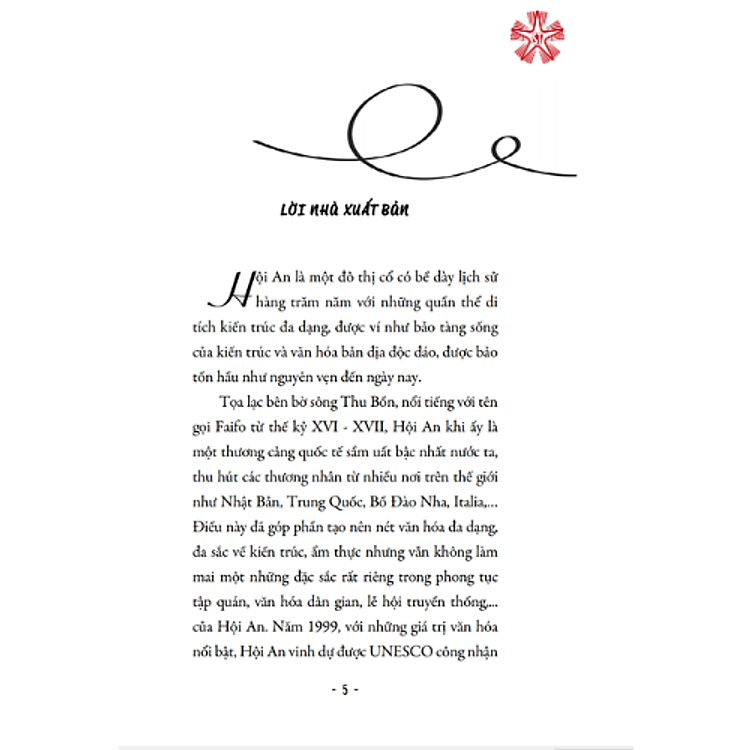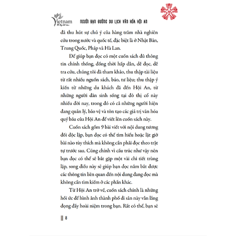 Cuốn sách mô tả về các di sản lịch sử và văn hoá của Hội An mà toàn bộ mô tả bằng lời, không có bất kỳ hình ảnh minh hoạ. Trình bày sách không đẹp.