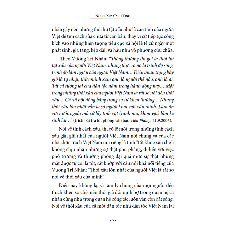 Ngoài ra trong phần II của cuốn sách này có thêm bài viết “Tổng thuật thói hư tật xấu người Việt” của tác giả Trần Văn Chánh, như một cách bổ sung cho đề tài “Người xưa cảnh tỉnh”. Cuốn sách này sẽ giúp ích rất nhiều cho thế hệ trẻ hôm nay trong việc nhận thức lại một cách chính xác về những ưu khuyết điểm của dân tộc m.ình, có phần khác hơn những gì họ đã từng được học trong các sách giáo khoa, từ đó nảy sinh tâm huyết đóng góp và biết cách đóng góp hữu hiệu xây dựng xã hội Việt Nam tốt đẹp hơn trong một tương lai không xa.